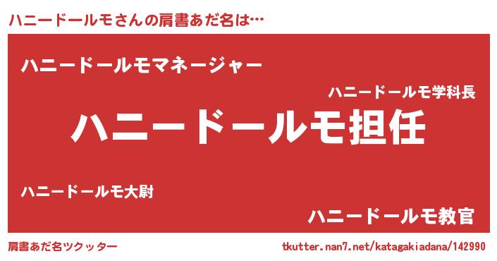 | 男性向けラノベタイトル風あだ名 | 『ハニードールモという概念が存在しない退屈な世界 』 |