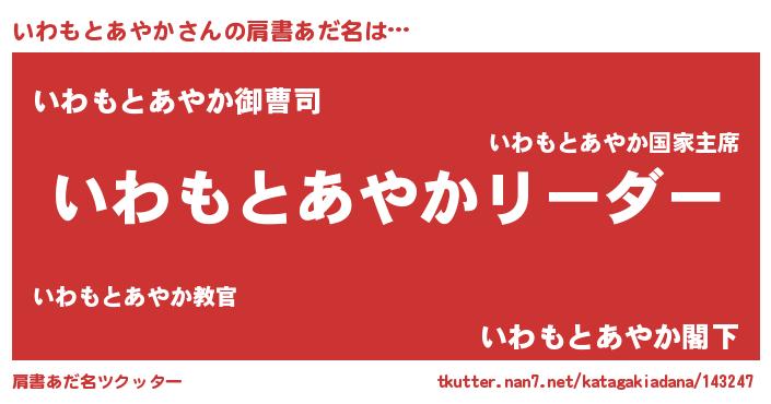 | 男性向けラノベタイトル風あだ名 | 『いわもとあやかの嫁は女の子じゃないと思った?』 |