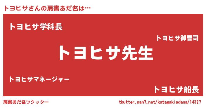 | 女子向けラノベタイトル風あだ名 | 『トヨヒサの契約王妃』『トヨヒサ恋絵巻』 |
