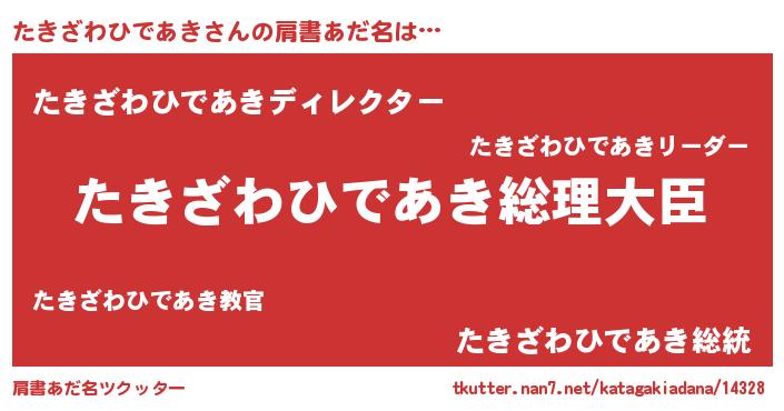 | 男性向けラノベタイトル風あだ名 | 『やはりたきざわひであきの青春ラブコメはまちがっている 』 |