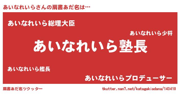 | 男性向けラノベタイトル風あだ名 | 『あいなれいらの嫁は女の子じゃないと思った?』 |