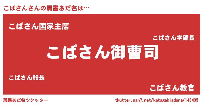 | 女子向けラノベタイトル風あだ名 | 『(仮)こばさんのやんごとなき事情』 |
