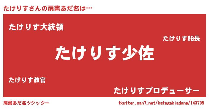| 男性向けラノベタイトル風あだ名 | 『転生したらたけりすだった件』 |