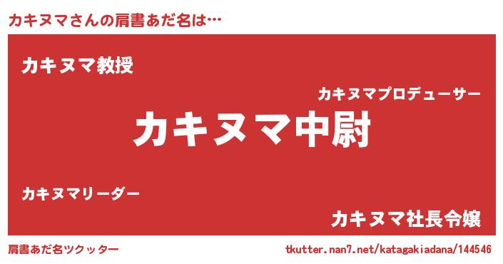 | 男性向けラノベタイトル風あだ名 | 『カキヌマ~年齢イコール彼女いない歴の魔法使い~』 |