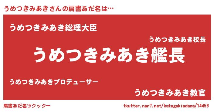 | 男性向けラノベタイトル風あだ名 | 『うちのうめつきみあきが世界を掌握している!』 |