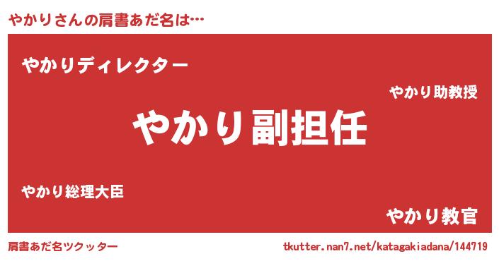 | 女子向けラノベタイトル風あだ名 | 『やかりの契約王妃』『死神やかりの再婚』 |