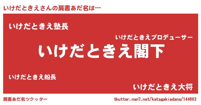 | ヒーロー風カッコイイあだ名 | 『究極戦士イケダトキエ』『黄金騎士イケ』 |