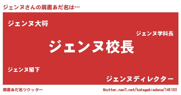 | 女子向けラノベタイトル風あだ名 | 『ジェンヌの契約王妃』『ジェンヌ恋絵巻』 |