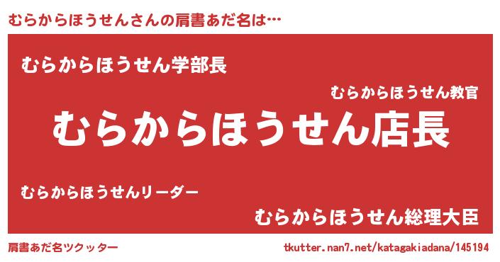 | 男性向けラノベタイトル風あだ名 | 『むらからほうせんの憂鬱』 |