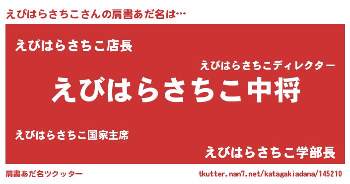 | 男性向けラノベタイトル風あだ名 | 『えびはらさちこ~年齢イコール彼女いない歴の魔法使い~』 |