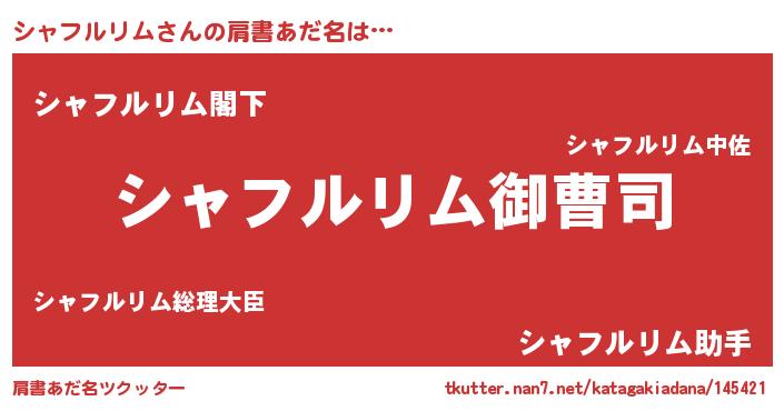| 女子向けラノベタイトル風あだ名 | 『シャフルリム姫と円卓の騎士』 |