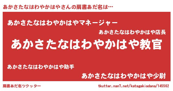 | 女子向けラノベタイトル風あだ名 | 『悪役あかさたなはわやかはやに転生したようですが、知った事ではありません』 |