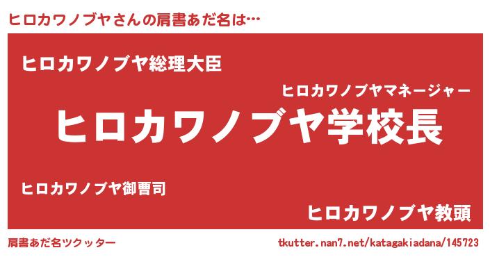 | 男性向けラノベタイトル風あだ名 | 『ノーゲーム・ノーヒロカワノブヤ』 |