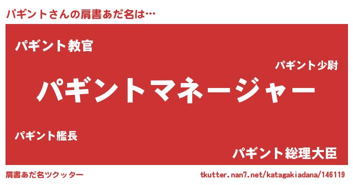 | 男性向けラノベタイトル風あだ名 | 『パギントに滅ぼされるだけの簡単なお仕事です』 |