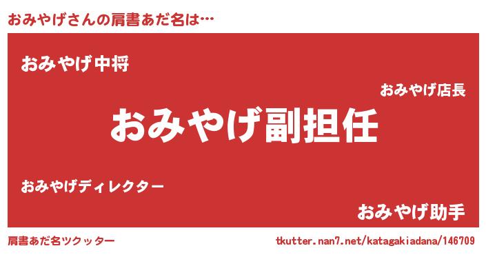 | 女子向けラノベタイトル風あだ名 | 『おみやげの契約王妃』『おみやげ恋絵巻』 |