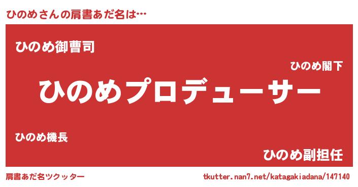 | 男性向けラノベタイトル風あだ名 | 『ひのめに滅ぼされるだけの簡単なお仕事です』 |
