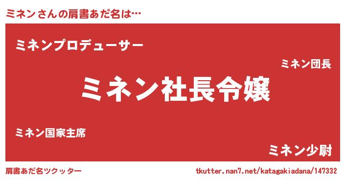 | 男性向けラノベタイトル風あだ名 | 『ミネンの憂鬱』『はたらくミネンさま!』 |