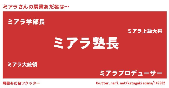 | ヒーロー風カッコイイあだ名 | 『黄金騎士ミア』『正義の使者ミアラ』 |