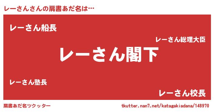 | 男性向けラノベタイトル風あだ名 | 『Re:レーさんから始める異世界生活』 |