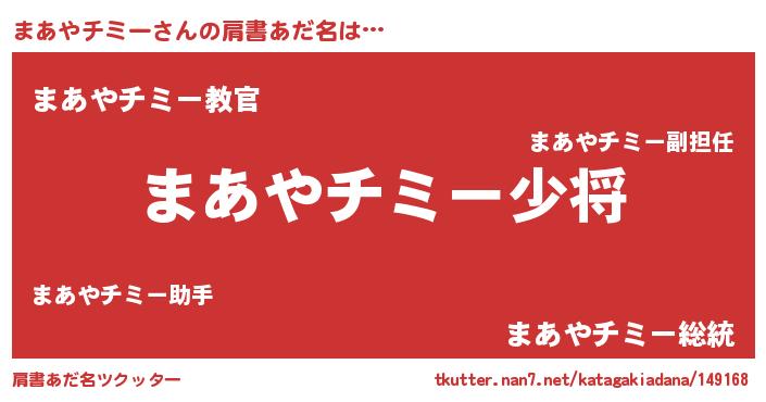 | 男性向けラノベタイトル風あだ名 | 『まあやチミー~年齢イコール彼女いない歴の魔法使い~』 |