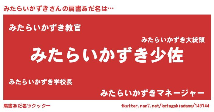 | 男性向けラノベタイトル風あだ名 | 『みたらいかずき~年齢イコール彼女いない歴の魔法使い~』 |