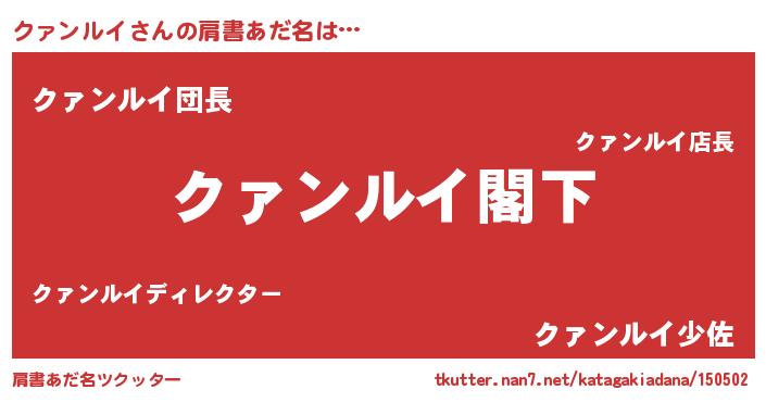 | 男性向けラノベタイトル風あだ名 | 『Re:クァンルイから始める異世界生活』 |