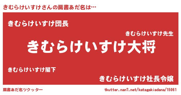 | 男性向けラノベタイトル風あだ名 | 『キムラケイスケスレイヤー』 |