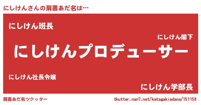 | ポケモン風あだ名 | 『ニシゴンZ』『ヒニシケン』 |
