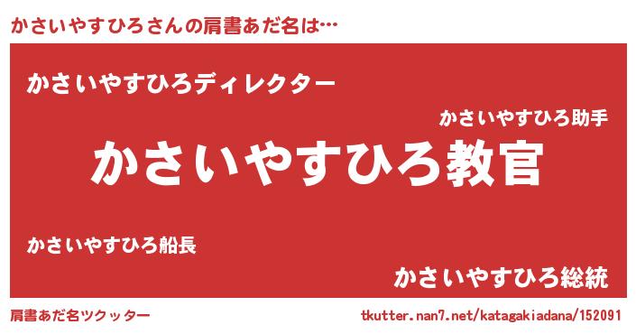 | 男性向けラノベタイトル風あだ名 | 『この素晴らしい世界にかさいやすひろを!』 |