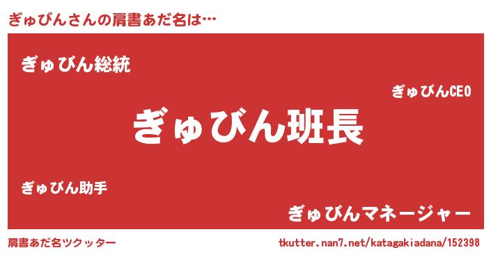 | ヘコむあだ名 | 『ぎゅ太郎』『ぎゅっふぃ~』『豆乳』 |