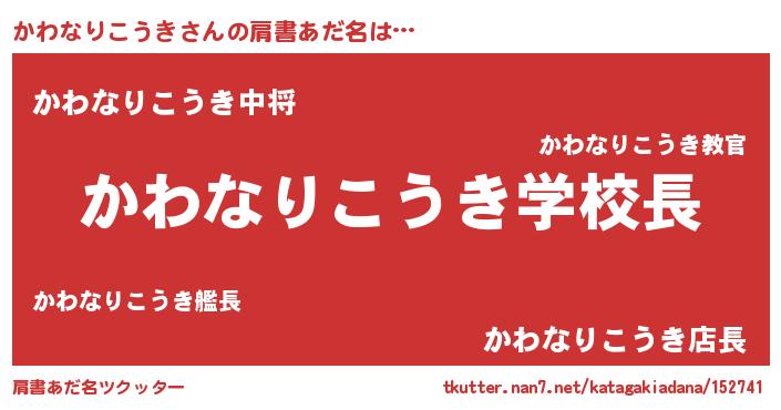 | 男性向けラノベタイトル風あだ名 | 『おまえをオタクにしてやるから、俺をかわなりこうきにしてくれ! 』 |