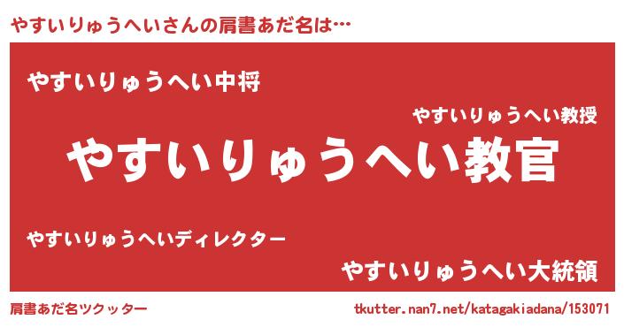 | 男性向けラノベタイトル風あだ名 | 『この素晴らしい世界にやすいりゅうへいを!』 |