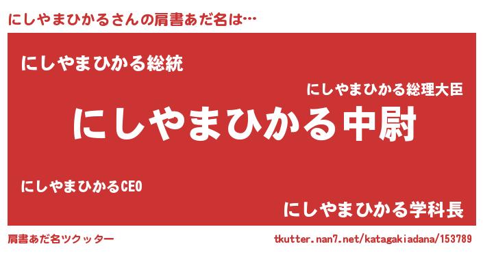 | 男性向けラノベタイトル風あだ名 | 『にしやまひかる~年齢イコール彼女いない歴の魔法使い~』 |