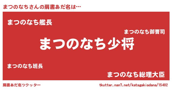 | 男性向けラノベタイトル風あだ名 | 『まつのなち~年齢イコール彼女いない歴の魔法使い~』 |