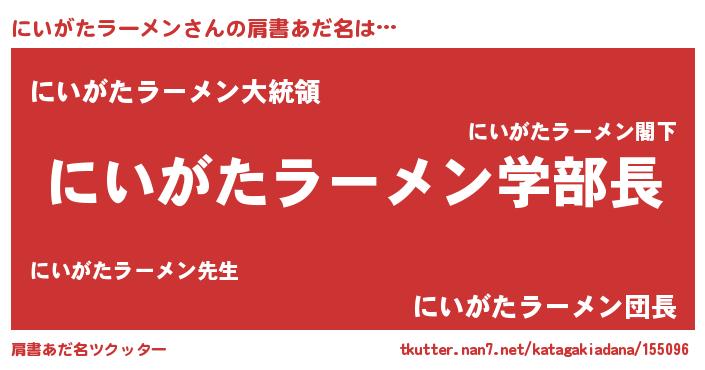 | 男性向けラノベタイトル風あだ名 | 『おまえをオタクにしてやるから、俺をにいがたラーメンにしてくれ! 』 |