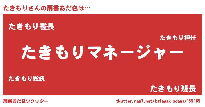 | 男性向けラノベタイトル風あだ名 | 『たきもりに滅ぼされるだけの簡単なお仕事です』 |
