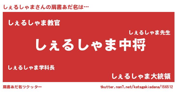 | 男性向けラノベタイトル風あだ名 | 『しぇるしゃま~年齢イコール彼女いない歴の魔法使い~』 |