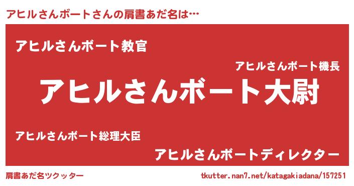 | 男性向けラノベタイトル風あだ名 | 『アヒルサンボートスレイヤー』 |