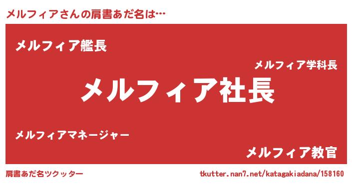 | 男性向けラノベタイトル風あだ名 | 『メルフィアの憂鬱』『緋弾のメルフィア』 |
