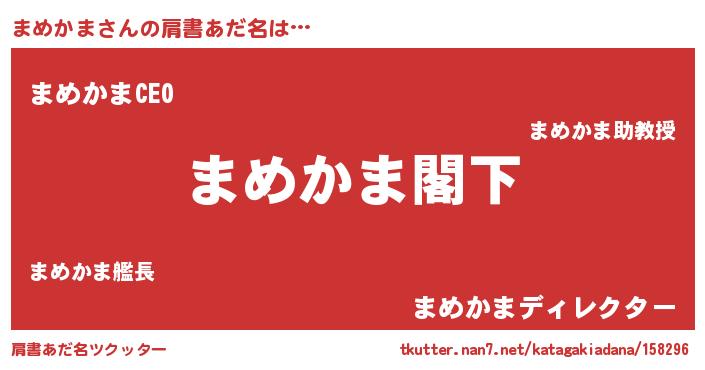 | 男性向けラノベタイトル風あだ名 | 『Re:まめかまから始める異世界生活』 |