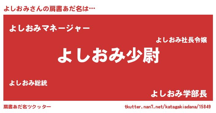 | 男性向けラノベタイトル風あだ名 | 『よしおみ~年齢イコール彼女いない歴の魔法使い~』 |