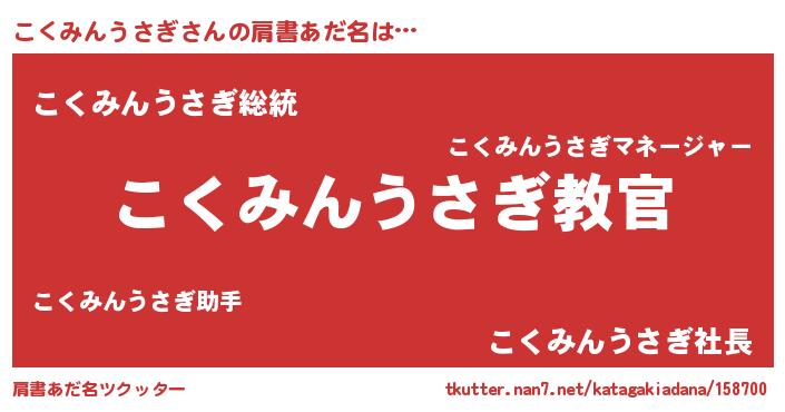 | 男性向けラノベタイトル風あだ名 | 『魔弾の王とこくみんうさぎ』 |