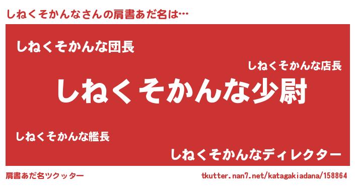 | 男性向けラノベタイトル風あだ名 | 『転生したらしねくそかんなだった件』 |