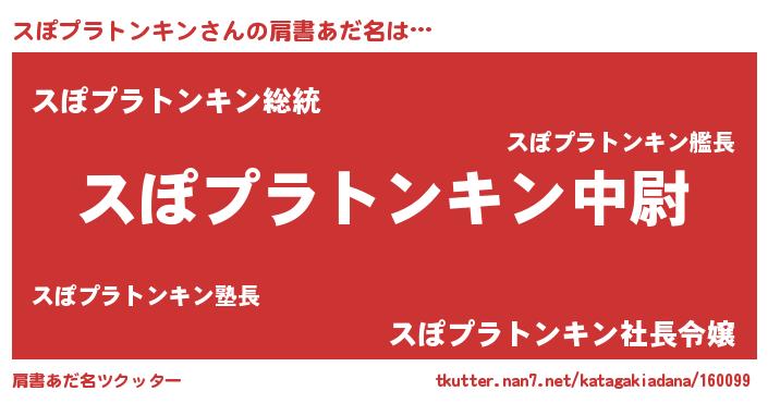 | 男性向けラノベタイトル風あだ名 | 『スぽプラトンキン~年齢イコール彼女いない歴の魔法使い~』 |