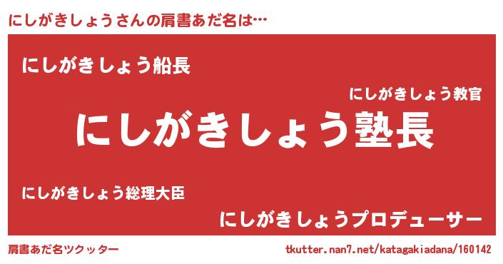 | 男性向けラノベタイトル風あだ名 | 『にしがきしょうの嫁は女の子じゃないと思った?』 |