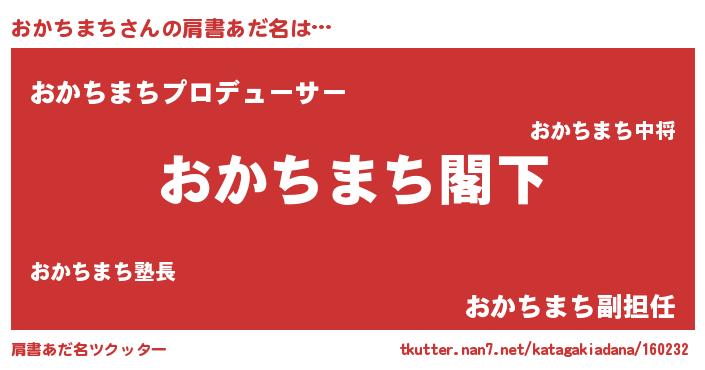 | 男性向けラノベタイトル風あだ名 | 『Re:おかちまちから始める異世界生活』 |