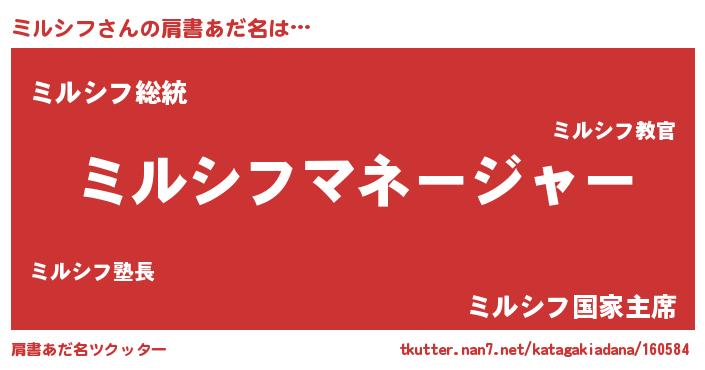| 男性向けラノベタイトル風あだ名 | 『ミルシフに滅ぼされるだけの簡単なお仕事です』 |