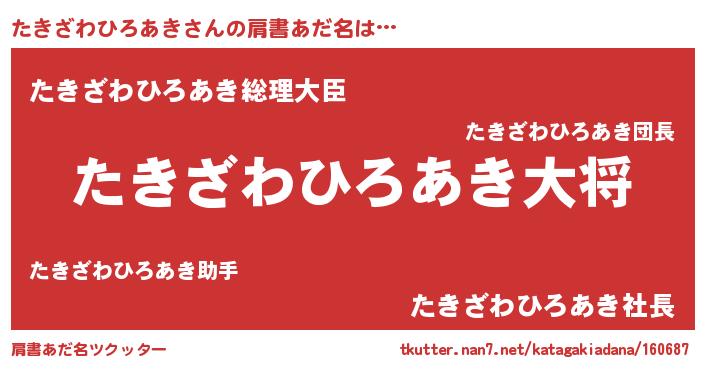 | 男性向けラノベタイトル風あだ名 | 『たきざわひろあき~年齢イコール彼女いない歴の魔法使い~』 |