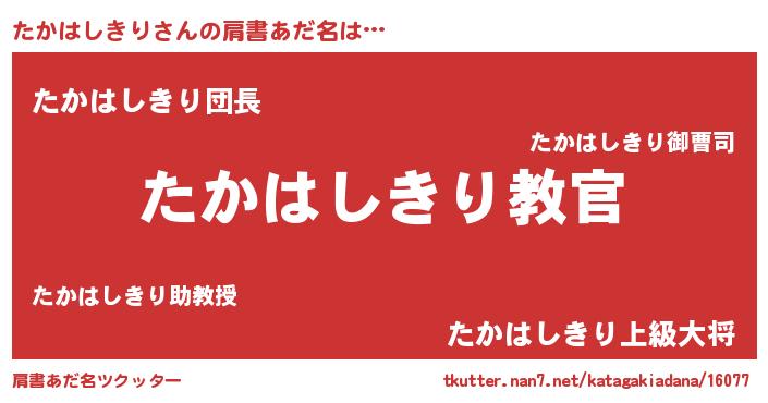 | 男性向けラノベタイトル風あだ名 | 『魔弾の王とたかはしきり』 |
