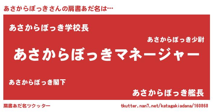 | 男性向けラノベタイトル風あだ名 | 『あさからぼっきに滅ぼされるだけの簡単なお仕事です』 |